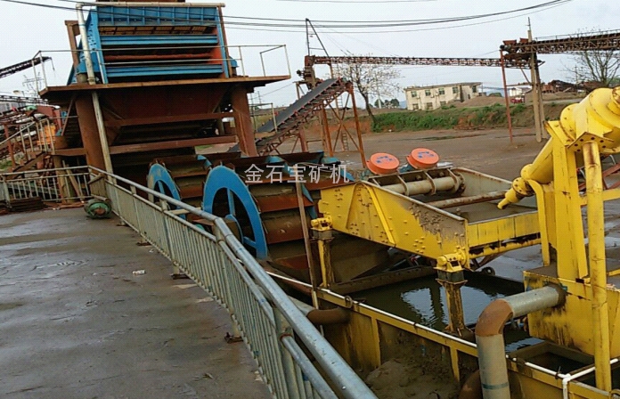 洗砂机工作时,电机通过三角带、减速机、齿轮减速后带动叶轮缓慢转动,砂石有给料槽进入洗槽中,在叶轮的带动下翻滚,并互相研磨,除去覆盖砂石表面的杂质,同时破坏包覆砂粒的水汽层,以利于脱水;同时加水,形成强大水流,及时将杂质及比重小的异物带走,并从溢出口洗槽排出,完成清洗作用。干净的砂石由叶片带走,砂石从旋转的叶轮倒入出料槽,完成砂石的清洗作用。