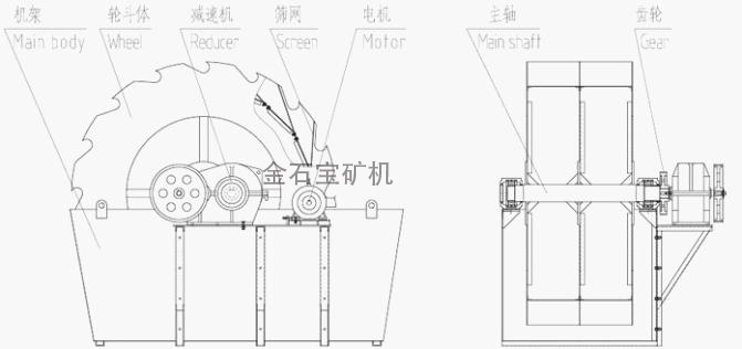 洗砂机主要结构部件有:机架、轮斗体、减速机、筛网、电机、主轴、齿轮等主要部件组成。