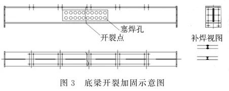 底梁主要在中间部位容易开裂,采用打坡口、焊接平,再加副板的方法解决,通过塞焊和断续焊接把副板和底梁固定在一起,能达到预期目的,延长使用寿命。