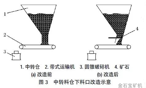 (3)在中细碎环节,中转料仓的下料口漏斗为垂直下料,一旦带式输送机停止运行,大量矿石就会堆积在上面,导致无法再次启动。