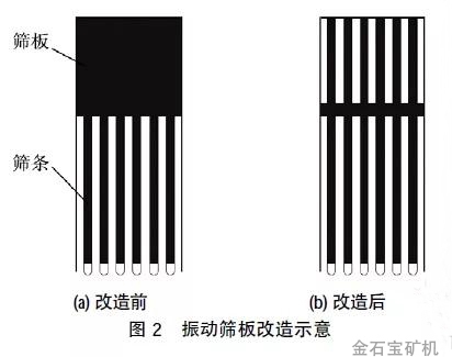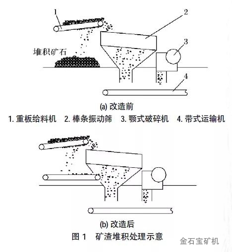 (1)如图1所示,在重板给料机下方增加1台带式运输机,给料机掉落的矿渣直接落在输送机上,由其运送至振动筛下料口的输送带上,解决了重板给料机下方堆积冻结矿渣的现象。
